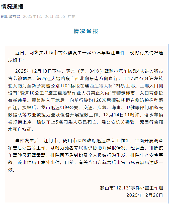 情况报道 近日,网络引起关注,我市巴彦古劳发生一起汽车坠河事件。现将相关情况通报如下:2025年12月13日下午,黄某(男,34岁)驾驶汽车,带4人至我市古老镇边境。他沿着西江大堤,从西北向东南笔直行驶。 17时27分左右,他左转驾车前往南海至新惠高速公路TJ01段在建的西江特大桥栈桥施工现场。施工现场入口侧有“限速10公里”、“重施工区域非作业人员禁止入内”等警示语。入口两侧设有减速带。黄某驾车进入工地后,向前行驶约120米后,撞上栈桥该处护栏,坠入西江。接到报告后,我们我市迅速组织公安、交通、应急、海事、卫生等部门以及蓝天救援队等专业救援力量和装备开展搜救。 12月14日11时左右,落水车辆被打捞上岸,车上5名司机和乘客确认死亡。经公安机关调查,死因符合溺水特征。事件发生后,江门市、鹤山市政府迅速成立工作组,全面开展调查和工作,第一时间提供协助,并通报死者家属。经调查,该车司机系醉酒驾驶、吸毒,经查明系矛盾误会和极端个人行为引发,并被裁定生产安全事故。该事件纯属意外。目前,有关各方已与死者家属就处理结果达成一致。鹤山市“12.13”事件处置工作组2025年12月26日